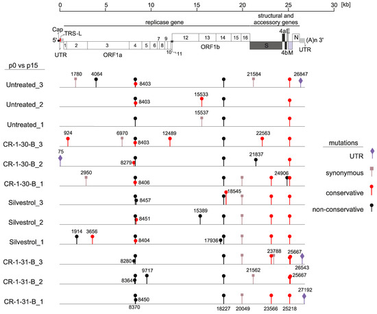 As shown exemplarily in Figure 1B, there was no increase of virus replication as a result of serial passaging of the virus in cells propagated in the rocaglate-containing medium. After 15 passages in cell culture, virus-containing supernatants were collected and used to obtain individual isolates by two consecutive end-point dilutions. The individual isolates were subsequently used in a challenge experiment to determine potential differences in drug sensitivity between non-passaged (p0) and serially passaged viruses (p15). As illustrated in Figure 1C, none of the passaged isolates displayed a reduced sensitivity to rocaglate treatment. All p15 isolates replicated with similar efficiency (e.g., CR-1-31-B p15 #2 and #3) or even less efficiently (e.g., CR-1-31-B p15 #1) compared to non-passaged (p0) virus (Figure 1C, black line). Moreover, the genomes of p0 and p15 viruses were sequenced to identify and compare potential mutations that were acquired during in vitro passaging (Figure 2). Most of the mutations were found to be randomly distributed over the virus genome, with very few single-nucleotide polymorphisms (SNPs) in each of the isolates. Besides synonymous mutations (Figure 2, light brown), several non-synonymous mutations (Figure 2, black and red) were identified, including conservative and non-conservative substitutions (by residues with similar or different physico-chemical properties; indicated in red or black, respectively, in Figure 2). Compared to the p0 non-passaged virus, all p15 virus isolates (including the controls) had acquired three non-synonymous mutations in the nsp4, nsp14 and M protein-coding regions, respectively, most likely resulting from a general cell culture adaptation process.