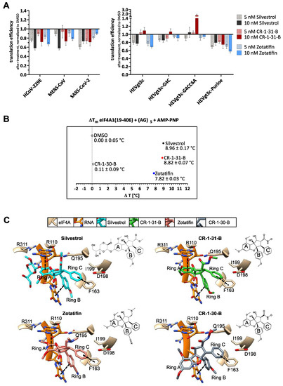 Translation inhibition, thermal shift assay and docking of silvestrol, CR-1-31-B and zotatifin. (A) Comparison of the inhibitory effects of silvestrol, CR-1-31-B and zotatifin on reporter gene expression constructs containing 5′-UTRs from coronaviruses HCoV-229E, MERS-CoV and SARS-CoV-2 and analyses of the 5′-UTRs of hepatitis E virus genotype 3c (HEVgt3c) and derivatives thereof with regard to their sensitivity towards silvestrol, CR-1-31-B and zotatifin treatment. Reporter gene expressions were normalized to transfection efficiencies and DMSO controls (n ≥ 3). Error bars show SEM. For predicted RNA secondary structures of HEVgt3c 5′-UTR and the respective variants, see Supplementary Figure S1 (B) Melting temperature of the eIF4A-polypurine RNA (AG)5-AMP-PNP complex in the presence of silvestrol, CR-1-31-B, zotatifin or the inactive enantiomer CR-1-30-B or DMSO to compare the binding affinities of rocaglates to eIF4A-RNA complexes. Numbers indicate the temperature shift compared to DMSO control ± SEM for n ≥ 3. (C) Predicted binding modes of silvestrol, CR-1-31-B, zotatifin and CR-1-30-B (inactive enantiomer of CR-1-31-B) to the human eIF4A-polypurine RNA (AG)5 complex (PDB: 5ZC9) using AutoDock Vina.
