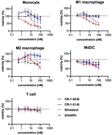 Next, the effects of the three rocaglates on the viability of primary human immune cells (monocytes, M1 macrophages, M2 macrophages, monocyte-derived dendritic cells (MdDCs) and T cells) were analyzed (Figure 4). The cytotoxic concentration of silvestrol that reduced the viability of monocytes and M1 macrophages by 50% (CC50) was 29 nM and 45.6 nM, respectively. For the treatment with CR-1-31-B, the obtained CC50 values for monocytes and M1 macrophages were 2.6 and 8.8 nM, respectively. No significant cytotoxicity could be observed for any of the rocaglates on M2 macrophages, MdDCs and T cells (see Figure 4). However, a concentration of 100 nM silvestrol or 100 nM CR-1-31-B reduced the viability of M2 macrophages and MdDCs by approximately 50%, whereas T cells were not affected (Figure 4, Table 1). Interestingly, 100 nM of zotatifin only reduced the viability of monocytes to approximately 75%. CR-1-30-B, the inactive (+)-enantiomer, had essentially no impact on cell viability at all. These data indicate that the cytotoxic effects of natural and synthetic rocaglates are cell type-dependent and compound-specific.