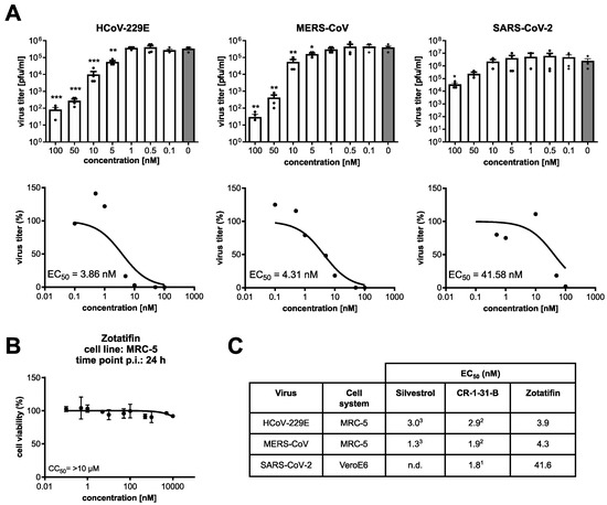 To determine and compare the antiviral activities of CR-1-31-B, silvestrol and zotatifin, MRC-5 or Vero E6 cells were inoculated with the respective virus at a MOI of 0.1 at 33 °C (HCoV-229E; SARS-CoV-2) or 37 °C (Middle East respiratory syndrome coronavirus (MERS-CoV)). After 1 h, the inoculum was removed, and cells were incubated with fresh medium containing the inhibitor at increasing concentrations. Supernatants were collected at 24 hpi and virus titers were analyzed by virus plaque assay [19]. To calculate the EC50 values, the virus titer determined for virus-infected cells treated with DMSO only was set to 100%, and titers obtained for treated cells were normalized to this value. EC50 values were calculated by non-linear regression analysis using GraphPad Prism 6.0 (GraphPad Software). For the infection of primary human airway epithelial cells, the apical surface was washed three times with PBS and cells were infected with MERS-CoV (MOI = 3). The inoculum was removed after 1 h and the medium in the basal compartment was replaced with a medium containing the indicated inhibitor concentrations. At the indicated time points, the apical surface of the cells was incubated with 100 µL/well PBS for 15 min and virus titers in the supernatants were determined by virus plaque assay. Challenge experiments were performed to assess potentially existing differences between non-passaged (p0) and serially passaged (p15) viruses in their viral replication efficiency in cells grown in rocaglate-containing culture medium. To this end, MRC-5 cells were infected with individual p15 and p0 virus isolates, respectively, at an MOI of 0.1 and kept in a medium containing the indicated concentrations of silvestrol, CR-1-31-B or in a medium without these compounds. Viral titers at 24 hpi were determined by plaque assay.