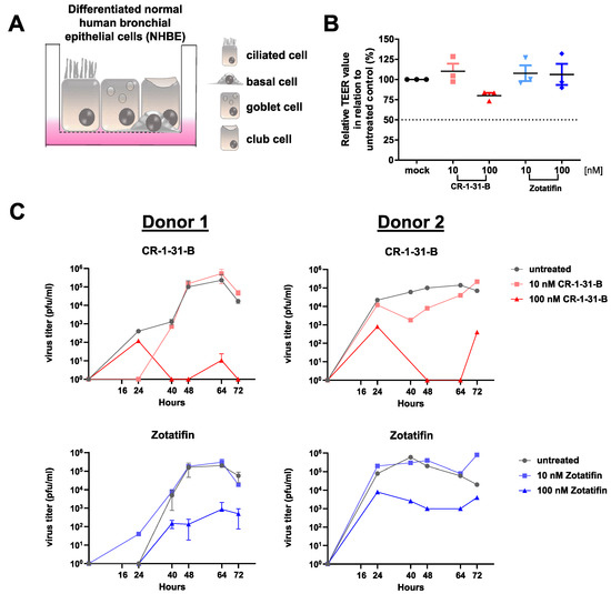 Comparison of antiviral effects of CR-1-31-B and zotatifin using human bronchial epithelial cells infected with MERS-CoV. (A) Human bronchial epithelial cells were cultivated and differentiated under the air–liquid interface into different airway epithelial cell types (basal, ciliated, club and goblet cells) and used to assess antiviral effects of the respective compounds. (B) Trans-epithelial electrical resistance (TEER) measurement of NHBE cells treated for 72 h with the indicated compounds. (C) MERS-CoV titers of infected NHBE cells from two different donors collected at the indicated time points p.i. and treated with CR-1-31-B or zotatifin (each at 10 and 100 nM) in comparison with the solvent control.