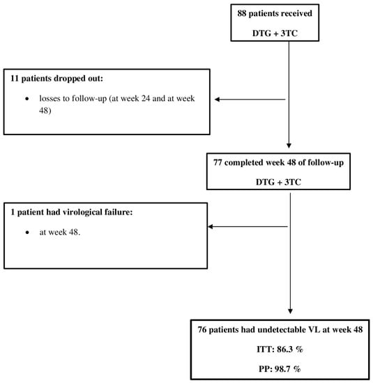 The study included 88 people living with HIV (PLHIV). The mean age was 35.9 years; 87.5% were men, and 76.1% were men who have sex with men (MSM). The mean baseline CD4 was 516.4 cells/uL (8% had Cd4 < 200 cells/uL), and the mean VL was 4.49 log10 (20% had VL > 100,000 cop/mL); 11.4% of patients were in the AIDS stage, and 1.1% had positive HBV surface and core antibodies. DT was initiated within one week of the initial specialist consultation in 100% of patients (median of 0 days: range, 0–7 days) and on the same day in 84.1%. Baseline resistance mutations (K103N, V106I + E138A, and V108I, respectively) were detected in three patients (3.4%). Table 1 list the remaining results. Eleven patients (12.5%) were lost to the follow-up, as shown in Figure 1.