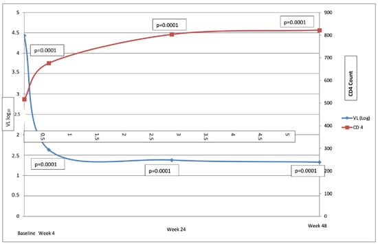 Time course of CD4 and viral load (baseline and weeks 4, 24, and 48 weeks).