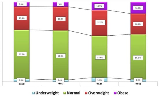 The mean weight of patients increased by 4 kg over the 48-week follow-up period (72.3 vs. 76.2 Kg; p = 0.0001) and their mean BMI increased from 23.8 ± 3.9 to 25.2 ± 4.43 (p = 0.0001), i.e., from normal weight at baseline to overweight at week 48. The distribution of the BMI-based classification of patients over the study period was: low weight in 3.5% at baseline vs.2.9% at week 48, p = 0.56; normal weight in 61.6% vs. 56.5%, respectively, p = 1; overweight in 29.1% vs 26.1%, respectively, p = 0.58; and obesity in 5.8% vs. 14.5%, respectively, p = 0.06 (Figure 3). Waist circumference was increased by 3 cm at 24 weeks of follow-up (p = 0.022).