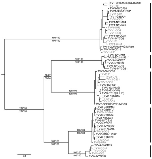 Amino acid (aa) sequences for fusion protein CP/RdRp were deduced from newly assembled TVV1 through TVV5 nt sequences and reference TVV1 through TVV4 nt sequences retrieved from NCBI GenBank (Supplementary Files S1 and S2); partial sequences from GenBank were excluded. These sequences were then aligned with MAFFT (v7.490) [24] using the L-INS-i algorithm (Supplementary File S3). Maximum-likelihood phylogenetic trees were built from this alignment using IQ-TREE (v1.6.11) [25] on the Los Alamos National Lab webserver (hiv.lanl.gov). The ‘find best and apply’ option [26] consistently identified JTT+F+I+G4 as the best model. Either standard bootstrapping (Felsenstein; n = 100) or ultrafast bootstrapping (UFBoot2 [27]; n = 1000) was conducted in consecutive runs of IQ-TREE, and consensus and bootstrap trees were saved from each run. Each set of trees was then used for transfer analysis by BOOSTER (v0.1.9) [28] on the Pasteur Institute webserver (booster.pasteur.fr). As expected, an essentially identical consensus tree was obtained from each analysis: identical in terms of branch topologies and branch lengths limited to two or three significant digits but differing in the support values for some branches. For optimized presentation, the consensus tree was visualized using FigTree (v1.4.4). Support values from both standard and ultrafast bootstrapping, both without and with subsequent transfer analysis, were provided for the main branches, as described in the Figure 1 legend. For reference, the original Newick tree files for these four different types of bootstrapping are provided as Supplementary Files S4–S7. The same analyses and presentation steps were additionally performed with the nt sequences of these TVV strains (Supplementary Figure S1), rather than with the CP/RdRp aa sequences, as shown in Figure 1.