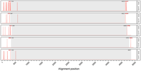 - Katoh, K.; Kuma, K.-i.; Toh, H.; Miyata, T. MAFFT version 5: Improvement in accuracy of multiple sequence alignment. Nucleic Acids Res. 2005, 33, 511–518. [Google Scholar] [CrossRef] [PubMed]