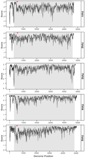 Indels were found to be largely excluded from the protein coding sequences (CDSs) of TVV genomes. No strains of TVV3 or TVV4 possess gaps within the CDS; all indels are in either the 5′ or 3′ UTR. One strain of TVV5 (TVV5-NYCA04) appears to possess a 12 bp deletion in the CDS, near the beginning of the CP gene and corresponding to a skip of 4 aa. TVV1 and TVV2 were found to each have two GenBank sequences with apparent insertions in the CDS. For TVV1, both sequences are for small amplicons from the study of an Iranian patient cohort [36]. TVV1-SH8 (GenBank accession AB701566.1) is a 149 bp amplicon sequence and contains an inserted guanosine residue at position 568 relative to the whole genome alignment with all other TVV1 strains. TVV1-SH4 (GenBank accession AB701562.1) is a 142 bp amplicon sequence with an inserted adenosine residue at position 579. In both cases, the inserted residue results in a frameshift that would yield a truncated CP with a divergent C-terminus. Removal of the 1 nt insertion in each of these cases restores the resulting CP sequence to match that in other known TVV1 sequences. For TVV2, both sequences with apparent insertions in the CDS are from the study of a Cuban patient cohort [37]. TVV2 strains C76 and C351 (GenBank accessions JF436870.1 and JF436871.1) each contain a multiple nt insertion near the beginning of the CP gene. TVV2-C76 possesses the insertion AAGAAA at positions 585–590, and TVV2-C351 possesses the insertion TAA at positions 588–590. These insertions maintain the coding frame and would result in the respective introduction of two or one extra aa into the CP. The indels identified within the CDS of these few TVV1, TVV2, or TVV5 strains might or might not reflect sequencing or assembly artifacts.