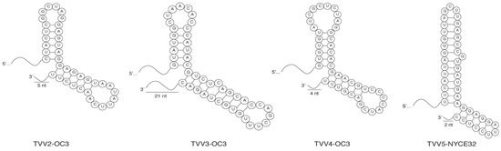 To evaluate conserved, terminal RNA structures across trichomonasviruses, secondary-structure predictions were performed for strains of all five species. Specifically, the first and last 100 nt from all TVV strains whose available sequences closely approach one or both expected termini of the TVV genome were analyzed for RNA secondary structures at the 5′ or 3′ end of their coding strands using RNAfold (v2.4.18) [38]. As expected from previous reports [10], a long stem–loop structure was again predicted at the 5′ terminus of each analyzed sequence, regardless of species and including for TVV5 strains. In addition, strains of TVV2, TVV3, TVV4, and TVV5 were predicted to possess a double stem–loop structure at the 3’ terminus of each analyzed sequence (Figure 4). This structure consists of two adjoining stem–loops with no intervening nt residues. These structures extend to within 5 nt of the expected 3′ terminus in TVV2, TVV3, and TVV5 strains, and to within 21 nt of the expected 3′ terminus in TVV4 strains. This conserved RNA feature could play a role in packaging the genome into virions and/or recognition by the viral RdRp.