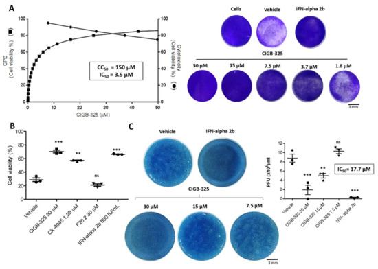In vitro antiviral activity of CIGB-325 against BCoV-Mebus. MDBK cells were pre-treated with CIGB-325 at the indicated doses for 1 h, and virus (14,000 TCID50/well) was then added to allow attachment for 1 h. Subsequently, the cells were incubated in the presence of the indicated drug concentration for 4 days. (A) IC50 (left axis) and CC50 (right axis) were estimated from the fitted dose–response curves based on treatment with five CIGB-325 concentrations determined by cell viability assay (left section). Crystal violet stain wells for each experimental condition in the CPE inhibition assay (right section) scale bars: 3 mm. (B) Antiviral effect of positive (IFN-alpha2b, CX-4945) and negative controls (F20.2) was determined by cell viability assay using crystal violet stain. Cells were infected as previously described and incubated with CIGB-325 (30 µM), F20.2 (30 µM), CX-4945 (1.25 µM), and IFN-alpha2b (500 IU). Uninfected cells with the vehicle were set to 100%. C. Progeny titers of the cell culture supernatants collected from CPE inhibition experiments were assessed using plaque assay. Data from (B,C) are shown as mean ± SD, n = 3. Statistically significant differences between vehicle and drug treatment are represented as ** p < 0.01, *** p < 0.001 and ns, not significant determined using one-way ANOVA followed Dunnett post-test.