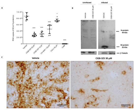 Impact of CIGB-325 on RNA copies of N protein and intracellular protein levels of N and M protein. MDBK cells were treated with the drugs 1 h before the viral challenge. Afterward, cells were infected with BCoV-Mebus (70,000 TCID50/well), and the appropriate drug’s concentration was maintained. Effect of CIGB-325 on the RNA copies of N protein and viral M and N proteins levels was investigated using qRT-PCR (A) and Western blot (B)/ immunocytochemistry (C), respectively. (A) qRT-PCR reaction was performed with specific oligonucleotides corresponding to N protein. N expression was normalized to GAPDH and HMBS genes and expressed as RNA copy number obtained after extrapolation in a calibration curve. Values are presented as mean ± SD (n = 9). Statistically significant differences between vehicle and drug treatment are represented as * p < 0.05 and **** p < 0.0001, determined using one-way ANOVA followed Dunnett post-test. (B,C). Cell preparations for Western blot and immunocytochemistry were carried out as described in Materials and Methods. A human anti-SARS-CoV-2 polyclonal antibody from one COVID-19 convalescent patient was used for identification of BCoV-Mebus M and N protein. Anti-β-tubulin blot was used as loading control. Viral proteins and β-tubulin protein were blotted in the same gel. Scale bars: 200 µm.