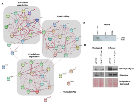 To envisage the putative biological processes that might be perturbed by CK2 targeting, enrichment analysis of the CIGB-325-interacting host proteins was performed. Protein folding and the response to unfolded protein, cytoskeleton organization, and cell cycle were significantly represented in the interactomic profile (Figure S6). We also searched for bona fide CK2 substrates among the CIGB-325-interacting proteins according to the Meggio and Pinna dataset [32], the list of high confidence CK2 substrates reported by Bian et al. [33], and the PhosphoSitePlus database (www.phosphosite.org, accessed on 6 June 2021). CIGB-325 interacted with 15 proteins previously described as CK2 substrates in MDBK cells (Table S2). To better understand the global putative connection among the CIGB-325 interactome in infected MDBK cells, we constructed a protein–protein interaction (PPI) network with the identified proteins, using information annotated in the STRING database (Figure 4A). In the PPI network, we detected two functional physiological complexes corresponding to proteins involved in cytoskeleton organization and protein folding, consistent with the most represented biological processes.