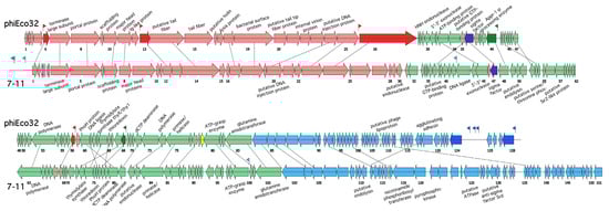 Salmonella enterica serovar Newport phage 7-11 (NC_015938) and Cronobacter sakazakii phage vB_CsaP_GAP52 (GAP52) (NC_019402) are also related to phiEco32-like phages. Comparison of phiEco32 and 7-11 genomes is schematically presented in Figure 1. 27.15% of 7-11 and 32.03% of phiEco32 ORFs are homologous to each other [1]. The genome of phage GAP52 [20] encodes 79 proteins homologous to 7-11 gene products, which corresponds to ~52% of 7-11 ORFs and ~69% of GAP52 ORFs (Supplementary Table S2). Despite the relatively high similarity of many proteins, the genomes of GAP52 and 7-11 share only 10% similarity at the nucleotide sequence level. Among the proteins common to 7-11 and GAP52, only 33 share common descent with phiEco32 proteins. Surprisingly, only 23 of these correspond to phiEco32-like phages’ core gene products. Since the number of homologous proteins between phiEco32 and 7-11/GAP52 is less than that shared by other Kuravirus phages, we consider phages 7-11 and GAP52 as members of a distinct “7-11 subgroup” among the phiEco32-like bacteriophages.