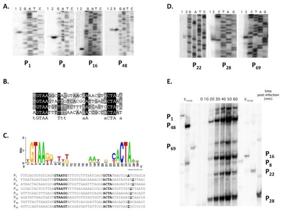 Time-resolved multiplex analysis showed that all primer extension products studied above became visible 20 min postinfection and reached a maximum at 50 min postinfection, and then their abundance decreased, likely due to cell lysis that became apparent 60 min postinfection (Figure 2E). Thus, the kinetics of accumulation of primer extension products corresponded to the late expression class. We therefore conclude that the bipartite motif, whose logo is presented in Figure 2D, defines the consensus of late promoters of phage 7-11.