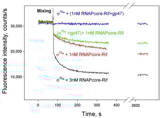 In the context of the holoenzyme, the labeled amino acid of σ70* is adjacent to the binding site of rifampicin (Rif), an inhibitor of transcription elongation that interacts with RNAP core [26]. Upon formation of the holoenzyme in the presence of Rif, the fluorescence of σ70* decreases, due to quenching of the σ70* fluorophore by Rif via the FRET mechanism (black curve) [17]. The degree of fluorescence quenching depends on the ratio of core and σ70 (red curve). When RNAP core bound to rifampicin was preincubated with SaPh711_gp47, followed by the addition of fluorescently labeled σ70*, no quenching was observed, even after a 1 h incubation with σ70* (blue curve), presumably because the σ70 binding site was occupied by SaPh711_gp47. When σ70 and SaPh711_gp47 were added to the Rif-bound RNAP core simultaneously, fluorescence quenching (green curve) was only moderately less than that observed in the same ratio of RNAP core/σ70 in the absence of SaPh711_gp47 (red curve). Since this experiment was performed under conditions when the concentration of SaPh711_gp47 was eight times greater than that of σ70, it follows that the formation of the holoenzyme with σ70 is faster than the formation of the SaPh711_gp47 holoenzyme. However, if the complex with SaPh711_gp47 is already formed, σ70 is unable to displace bound SaPh711_gp47.