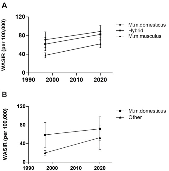 - Chao, T.; Cai, H.; Zhou, Y.; Li, K.; Xiao, J. Distribution of Subspecies of the House Mouse, Mus musculus (Rodentia: Muridae) in East China as Inferred from Mitochondrial D-loop Sequences. Pak. J. Zool. 2017, 49, 1175–1184. [Google Scholar] [CrossRef]