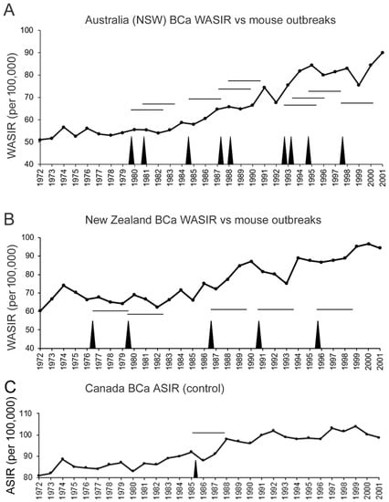 2.2. Correlation of Mouse Population Outbreaks and Annual Breast Cancer Incidence Rates