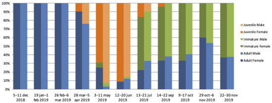 Between December 2018 and November 2019, eleven field missions were conducted to capture Eidolon helvum bats, from a bat colony estimated to be of around 100,000 individuals by manual counting at each mission (F. Mba Djonzo, personal observation). Dried blood spots (DBS), rectal and oral swabs were obtained from 820 bats. Overall, 192 (23.4%) and 181 (22.1%) were adult female and male bats, respectively. Adult bats were collected at each session, but between December and March only adults were captured (Figure 1, Supplementary Table S2). Juvenile bats, 108 (13.2%) female and 113 (13.8%) male were mainly captured between March and July and were predominant in capture sessions from May to June. Immature adult bats, 104 (12.6%) females and 122 (14.9%) males, were captured from May to November and were predominant during capture sessions from July to November. Among the adult females, 13/192 (6.8%) were pregnant and they were observed during capture sessions conducted in January, February, and November. Lactation was observed during capture sessions from March to May in a total of 68 (35.4%) adult females. In January, four females were observed with the pup attached.