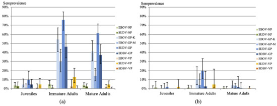 Percentage of bats per age category with antibodies to the different Ebolavirus antigens with less stringent cut-off (4 × standard deviation) (a); and stringent cut-off (statistical methods described in methods) (b) calculations. Bars correspond to the 95% confidence limits, corresponding p values comparing the antibody reactivities for each antigen among the different age categories are shown in Table 3.
