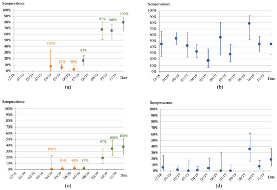 Proportion of samples reactive with the Ebola Zaire Kissidougou glycoprotein (GP-EBOV-k) according to the less stringent cut-off (4 × standard deviation) value for juveniles (orange dots) and immatures (green dots) (a); and adults (blue dots) (b); and with stringent (statistical methods described in methods) cut-off value for juveniles and immatures (c); and adults (d). Percentages above the orange and green dots of juvenile and immature bats respectively, correspond to the proportion of the dominant age class during the collection session indicated in the same color of the corresponding dots. Bars correspond to the 95% confidence limits.
