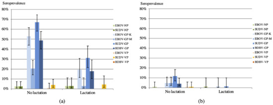 Percentage of adult female bats with antibodies to the different Ebolavirus antigens according to lactation status at capture with less stringent cut-off (4 × standard deviation) (a); and stringent cut-off (statistical methods described in methods) (b) calculations. Bars correspond to the 95% confidence limits, corresponding p values comparing the antibody reactivities for each antigen among lactating and non-lactating females are shown in Table 3.