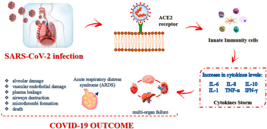 Current therapies used for COVID-19 target the so-called “cytokine storm” (CS), also known as cytokine release syndrome (CRS) [77]. Indeed, COVID-19 is characterized by dramatically elevated levels of inflammatory cytokines, mainly IL-6, IL-8, IL-10, IL-1, tumor necrosis factor-α (TNF-α) and interferon-γ (IFN-γ), as depicted in Figure 1. These pro-inflammatory mediators can provoke systemic inflammatory response syndrome, resulting in acute respiratory distress syndrome (ARDS).