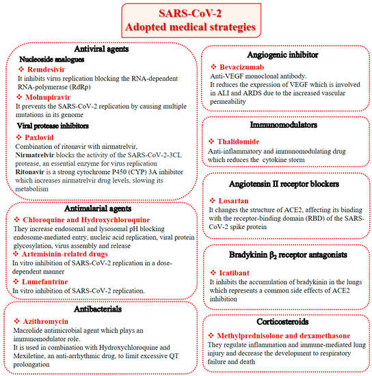 Beyond therapies targeting cytokines, other treatments have been extensively reviewed recently [80], namely antiviral agents, antimalarial agents, antibacterials, immunomodulators, angiotensin II receptor blockers, bradykinin B2 receptor antagonists, corticosteroids, anthelmintic, antiprotozoal, H2 blockers and anticoagulants. However, alternative and effective therapies to overcome the already known and/or the unforeseen possible manifestations of SARS-CoV-2 in the near future may be needed. The most important therapeutic drugs available for the treatment of COVID-19 are summarized in Figure 2.
