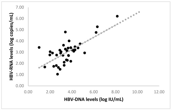 Correlation between HBV-DNA (log IU/mL) and HBV-RNA (log copies/mL) levels in HBeAgNeg patients.