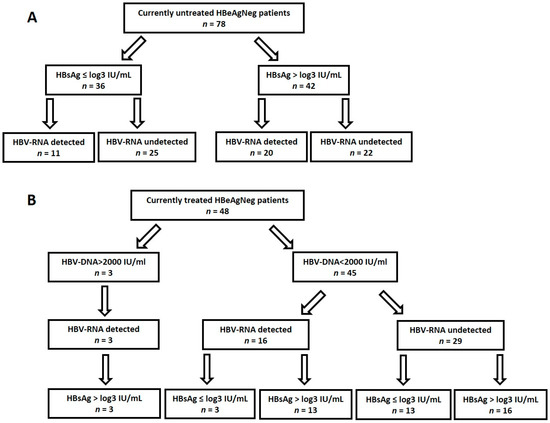 Categorization of HBsAgNeg patients by treatment, and levels of HBV-DNA, HBV-RNA and HBsAg. (A)—Currently untreated patients. (B)—Treated patients.