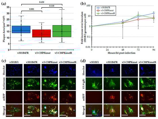 Following the reconstitution of r301B/1 clones with CHPK-null mutation (r3-CHPKmut) and rescued CHPK (r3-CHPKmutR), we first tested replication in CEC cultures using plaque size and viral replication kinetic assays. Plaque size assays revealed a significant difference in the replication of v3-CHPKmut compared to v301B47R, while the rescuant virus (v3-CHPMmutR) was not different from v301B47R (Figure 2a). Viral replication kinetics showed no significant differences (p > 0.05) between the viruses at each time point (Figure 2b). Representative plaques for each virus are shown in Figure 2c,d. In all, these results suggests that 301B/1 CHPK plays a role in cell-to-cell spread, based on plaque size assays; however, it does not seem to affect overall viral DNA replication based on replication kinetics in cell culture.