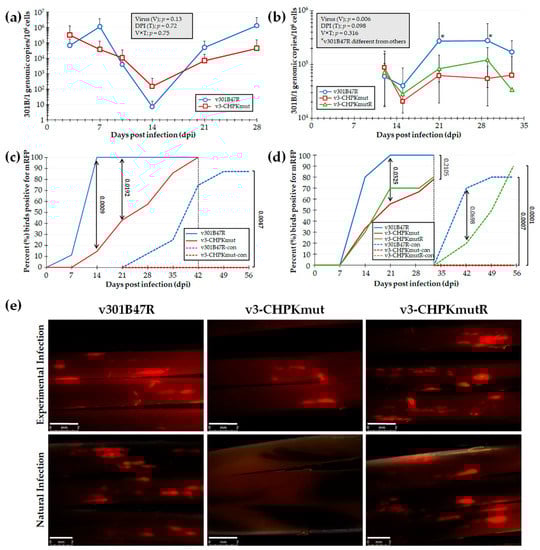Since v3-CHPKmut was unable to transmit to contact chickens, a second experiment was conducted including v301B47R, v3-CHPKmut, and v3-CHPKmutR. Here, 10 chickens were inoculated with 10,000 PFU of each virus and housed with 10 uninfected contact chickens over the course of 63 dpi. Using qPCR assays to measure 301B/1 replication in the blood of experimentally infected chickens (Figure 3b), two-way ANOVA revealed a significant difference between viruses (V; p < 0.05) and a tendency within DPI (D, p = 0.09) in replication, while differences were non-significant for the interaction between virus and DPI (V × D, p > 0.05). Overall, v301B47R showed a tendency (V, p = 0.06) to be different from v3-CHPKmut, while not being different (V, p > 0.05) from v3-CHPKmutR. There was no difference between v3-CHPKmut and v3-CHPKmutR, while v301B47R showed significantly higher viral loads at 21 and 29 dpi than both v3-CHPKmut and v3-CHPKmutR.