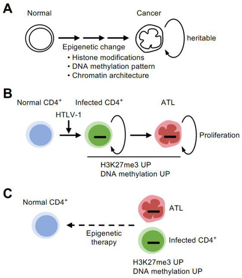 Notably, preclinical studies have shown the concept that targeting both EZH1 and EZH2 can normalize the accumulation of H3K27me3 not only in high-grade tumor cells but also in cells in a precancerous state infected with HTLV-1 present in the peripheral blood of infected individuals [28] (Figure 1C). Recently, abnormalities in methylated DNA, which similarly suppresses gene expression, have been comprehensively investigated [11,29]. Similar to the H3K27me3 abnormality, DNA methylation has also been shown to be abnormal in infected cells of carriers that have not yet developed the disease. New therapeutic strategies targeting such early stage epigenomic abnormalities are expected to be one of the major challenges for early therapeutic intervention for diseases with poor prognosis.