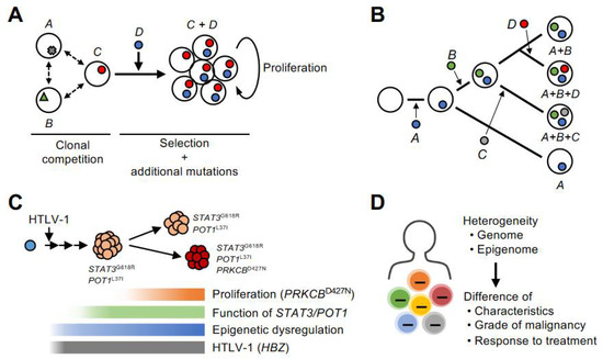 One important implication is that many of the genetic abnormalities can be detected before the disease onset. Rowan et al. used deep sequencing to go back in time and detect most of the genetic abnormalities during the carrier phase and showed that they clonally expanded as the disease progressed [35]. Marçais et al. reported the evolution of ATL cells with various genetic mutations in progression from indolent type to aggressive type and before and after chemotherapy [36]. Such early detection of genetic abnormalities and traces of clonal evolution have been confirmed in our Japanese cohort [37]. These observations are consistent with the theory of natural selection of species, and lead to the conclusion that cancer evolves through clonal selection and propagation (Figure 2B).
