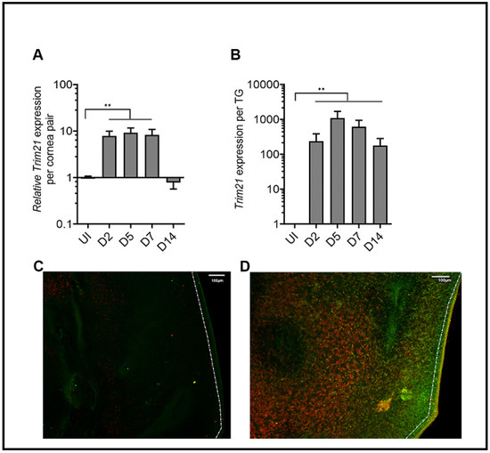 TRIM21 expression in the cornea and trigeminal ganglia. Male and female C57BL/6 (B6) mice were infected in the cornea with HSV-1 (103 plaque forming units (PFU) in 3 ul PBS. At the indicated time post infection (pi), the (A) corneas (5–7 samples/time point) or (B) trigeminal ganglia (TG) (3–5 samples/time point) of infected mice were removed and assessed for expression of TRIM21 by real-time RT-PCR. Bars represent the mean relative value + SEM, ** p < 0.01, comparing the indicated groups as determined by one-way ANOVA and Kruskal–Wallis multiple comparison test. Representative confocal images of (C) uninfected and (D) infected corneas stained for TRIM21 (red) and HSV-1 (green) antigen at 3 days post infection. Uninfected (UI) mice served as controls. The white scale bar = 100 µm.