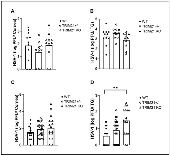 HSV-1 levels are elevated in the trigeminal ganglia of TRIM21 KO mice at day 7 post infection. Male and female C57BL/6 (WT), TRIM21+/−, and TRIM21 KO mice (n = 11–22/group) were infected with HSV-1 (103 PFU/cornea). At day 3 (A,B) or day 7 (C,D), the corneas (A,C) and trigeminal ganglia (TG) (B,D) of infected mice were removed and processed to determine viral load/tissue by standard plaque assay. Bars represent mean + SEM, ** p < 0.01 comparing the TRIM21 KO to WT mice day 7 pi, as determined by one-way ANOVA and Kruskal–Wallis multiple comparison test.