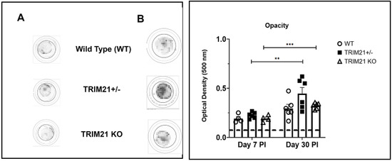 Acute corneal infection of mice results in tissue pathology, including opacity and neovascularization [36,41,42,43]. Therefore, corneal opacity was quantified during acute infection (day 7 pi) into latency (day 30 pi). The results show that, similar to WT and TRIM21+/− mice, TRIM21 KO mice displayed the same degree of opacity at day 7 (Figure 3A) and day 30 (Figure 3B) pi. The opacity increased as the infection progressed from day 7 to day 30 pi, with significant differences comparing the TRIM21+/− and TRIM21 KO at day 7 to day 30 pi.