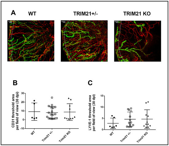 Consistent with these results, corneal neovascularization was also similar between genotypes, with WT, TRIM21+/− and TRIM21 KO showing the same degree of blood and lymphatic vessel genesis into the central cornea by day 30 pi (Figure 4). Representative corneal vascularization images for WT, TRIM21+/−, and TRIM21 KO show similar levels of blood and lymphatic vessel genesis into the central cornea (Figure 4A), summarized for area occupied by blood (Figure 4B) and lymphatic (Figure 4C) vessels at 30 days pi.
