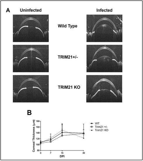 HSV-1 infection is also known to elicit cornea edema, likely due to the expression of pro-inflammatory cytokines and recruitment of leukocytes, including neutrophils, via chemokines to the site of infection [44,45,46]. We previously utilized SD-OCT to assess corneal edema following HSV-1 infection of mice [47]. Therefore, we assessed whether the absence of TRIM21 impacted the level of cornea edema, following HSV-1 infection. WT, TRIM21+/−, and TRIM21 KO mice were infected with HSV-1 and evaluated for cornea edema over time, until day 30 pi. Prior to infection, mice were imaged by SD-OCT, to establish a baseline. The results showed that, although HSV-1 induced a 30–40% increase in cornea edema, there was no difference in the amount of swelling between the genotypes of animals tested (Figure 5A,B). Taken together, the absence of TRIM21 within the cornea was not reflected by quantitative changes in ocular pathology, suggesting that TRIM21 plays little, if any, role in the host response to local virus infection and tissue pathology within the cornea.
