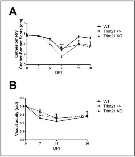 Performance of the visual axis drops in WT, TRIM21+/−, and TRIM21 KO mice following HSV-1 infection. Male and female C57BL/6 (WT), TRIM21+/− and TRIM21 KO mice (n = 5–15/group/time point) were infected with HSV-1 (103 PFU/cornea). At the indicated time point, before (0) or after infection, the mice were evaluated for (A) mechanosensory function using a Cochet–Bonnet esthesiometer, to measure the blink reflex, or (B) assessed for visual acuity by optomotor kinetic tracking. All mice lost corneal sensation, with a maximum effect at 7 days post infection (DPI) and partial to complete recovery (in the case of WT mice) by 30 DPI (A). A 40% reduction in visual acuity was observed in all mouse groups, with a maximum effect at 15 DPI and partial recover by 30 DPI (B). Each point graphed represents the mean ± SEM. *** p < 0.001 comparing the 7 DPI to uninfected (0) time point, as determined by ANOVA and Tukey’s multiple comparison test.