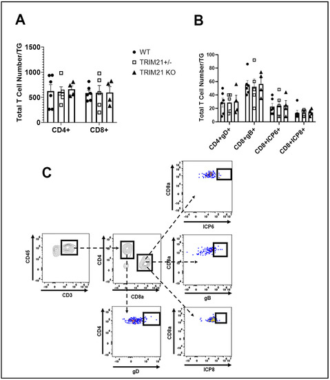 Historically, T cells are thought to control HSV-1 replication in the TG during acute and latent infection following ocular HSV-1 challenge [54,55,56,57]. Since infectious virus detected in the TG of TRIM21 KO mice was equivalent to that found in the WT mice at day 3 pi, but elevated by day 7 pi, we interpreted these results as suggesting that the adaptive arm of the immune system likely plays a more significant role compared to the innate immune response within the TG of TRIM21 KO mice, relative to virus surveillance. Therefore, we initially investigated the T cell infiltrate and function in the TG at day 7 pi in WT, TRIM21+/−, and TRIM21 KO mice. The results showed no deficiency in the number of total (Figure 7A,C) or HSV-1-specific CD4+ or CD8+ T cells (Figure 7B,C) residing in the TG of HSV-1-infected TRIM21 KO mice compared to WT or TRIM21+/− animals.