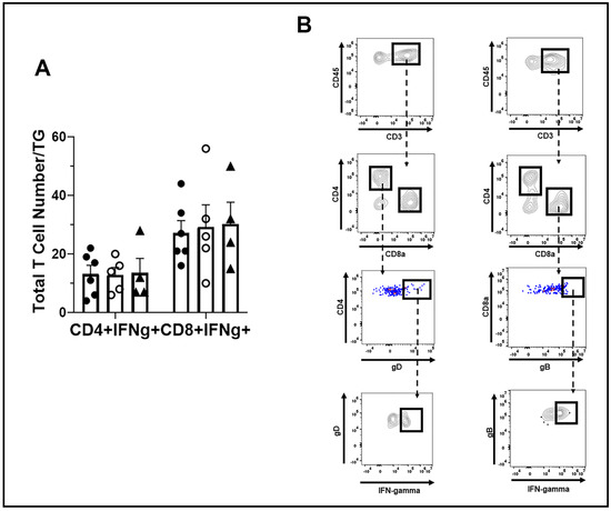 For evaluation of interferon gamma (IFN-γ) producing T cells, the single TG cell suspension was placed into RPMI (supplemented with 10 mM D-glucose, 10% FBS, 1mM sodium pyruvate 2 mM L glutamine, and 1× antibiotic-antimycotic solution) and stimulated with 100 nM phorbol 12-myristate 13-acetate (PMA) and 1 μM ionomycin (both from MilliporeSigma, Burlington, MA, USA) for 6 h in the presence of brefeldin A (GolgiPlug from BD Biosciences/ThermoFisher Scientific ). After the incubation period, the cells were washed with SB and stained with Zombie Aqua, followed by washing and staining with antibody cocktail (consisting of anti-CD45, CD3, CD4, or CD8) and PE-, AlexaFluor488, or BV421-conjugated HSV-1 tetramers, as described above, with the same incubation conditions. Finally, the cells were fixed and permeabilized with Foxp3/Transcription Factor Staining Buffer Set (Thermo Fischer Scientific) according to the manufacturer recommendations. At the permeabilization step, anti-mouse IFN-γ Ab conjugated with FITC (Thermo Fischer Scientific) was added to the cell suspension, followed by incubation at room temperature for 45 min. Subsequently, the cells were washed with permeabilization buffer, acquired using a spectral flow cytometer Aurora (Cytek Biosciences), and analyzed using FlowJo software (FlowJo LLC).
