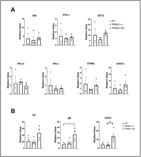 Since greater susceptibility of TRIM21 KO mice to HSV-1 replication in the TG could not be explained by a deficiency in T cell infiltrate or function, other mechanisms were explored. TRIM21 is thought to be regulated by IFN regulatory elements, including IFN regulatory factor (IRF)1 and STING, as well as regulate type I IFN expression through IRF3 [37,58,59,60]. Moreover, type I IFNs and STING-mediated pathways contribute to the host defense against HSV-1 infection, by preventing replication of the virus [14,19,61,62,63]. Therefore, we, next evaluated levels of type I IFN and downstream effector pathways activated in response to type I IFN in the TG of HSV-1-infected mice. The results showed that the levels of type I IFNs, including IFN-α1, IFN-α4, and IFN-β, which have previously been found to be potent inhibitors of HSV-1 replication [35], were similar between TG from WT, TRIM21+/−, and TRIM21 KO mice (Figure 9A). Furthermore, downstream effector molecules of type I IFN-activated pathways that antagonize HSV-1, including tetherin (Bst2) [64] and oligoadenylate synthetases (OAS) [13,65] were found to be expressed at equivalent levels, as was STING and DAI in the TG of HSV-1-infected WT, TRIM21+/− and TRIM21 KO mice (Figure 9A), even though HSV-1 lytic gene expression (including ICP27, TK, and gB) was elevated in the TG of TRIM21 KO mice (Figure 9B). Therefore, the increased susceptibility of TRIM21 KO mice to HSV-1 replication in the TG, following ocular infection, is not due to changes in type I IFN expression or changes in the levels of IFN-inducible effector molecules OAS1a or tetherin found in the tissue.