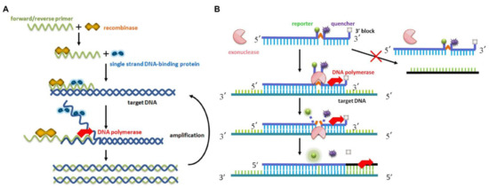 Schematic representation of the RAA-based amplification process: (A) reaction mechanism based on RAA recombination; (B) principle of real-time fluorescent RT-RAA.