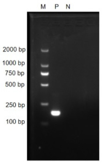 The agarose gel electrophoresis results of PCR amplified products with the real-time RT-RAA primers. M: D 2000 marker; P: positive control, i.e., PEDV N gene plasmid; N: negative control, i.e., ddH2O.