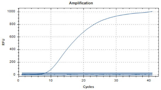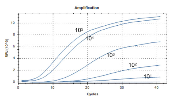 The lowest detection line for the real-time fluorescent RT-RAA primers and probes designed in this study was 101 copies/µL. We selected a representative result of the three independent experiments as shown in Figure 3.