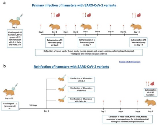 The experiments were performed in the Containment Facility of ICMR-National Institute of Virology, Pune. Three study groups of 17 female Syrian hamsters (procured from a CPCSEA-authorized breeding facility) 12–14 weeks old were included in the study to assess pathogenicity/virus shedding. A virus dose of 105 TCID50 (0.1 mL volume) of the Delta/Delta AY.1/B.1 variants was used intranasally to inoculate the hamsters (Figure 1a). Throat swab, nasal wash and faeces samples (n = 7) were collected on alternate days during the study period. Hamsters were observed for a period of 14 days for body weight loss, and five hamsters/group were sacrificed 3, 7 and 14 days post infection (DPI) to collect organs (lungs, nasal turbinates, heart, liver, kidney, intestine, spleen and brain) and blood samples.