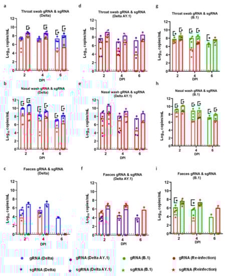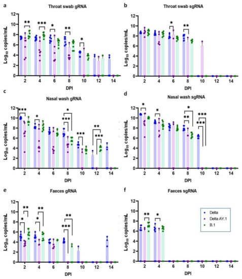 In the throat swab and the nasal wash samples, genomic RNA (gRNA) was detected with a decreasing trend until 12 DPI in the Delta AY.1- and the B.1-infected groups and until 14 DPI in the Delta variant-infected group. The average viral gRNA levels in the throat swab were significantly lower in the Delta AY.1-infected group on 6, 8 and 10 DPI, as were the subgenomic (sg) RNA levels on 8 DPI in comparison with the Delta variant group (Figure 3a,b). The nasal wash and faeces viral RNA loads were also significantly lower in the Delta AY.1-infected group (Figure 3c–f).
