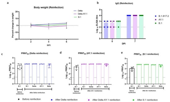 After re-infection, body weight loss in all the infected groups was minimal irrespective of the variant used for infection (Figure 4a). The mean (±SD) body weight change on 7 DPI post re-infection was 1.74 (±3.9), 0.67 (±3.8) and −0.3 (±3.05)% in the Delta, Delta AY.1 and B.1 groups, respectively. The geometric mean IgG titre as determined by ELISA was 316, 316 and 562.3 against the Delta, Delta AY.1 and B.1 variants, respectively, on the day of re-infection, and rose to 104 on 7 DPI in all the groups (Figure 4b). Post re-infection, the PRNT50 titres showed a rise in titres against all the variants, i.e., B.1, Beta, Delta and Delta AY.1 variants (Figure 4c–e). Serum IL-6 levels did not show any significant elevation, as in the case of the primary infection in the re-infected groups. Other cytokines did not show any significant increase either (Supplementary Figure S3).