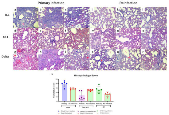 Histopathological changes observed in lungs after primary infection and re-infection. Lung sections from hamsters infected with the B.1 variant showing (a,b) Diffuse interstitial pneumonia and (c) large foci of alveolar interstitial thickening, inflammatory cell infiltration, loss of bronchial epithelium and congestion in the parenchyma on 7 DPI after primary infection, as revealed by H&E staining, scale bar = 100 µm. Lung sections from hamsters infected with the Delta AY.1 variant showing (d) diffuse alveolar capillary engorgement, (e) peribronchial inflammatory cell infiltration and (f) diffuse alveolar capillary engorgement and hemorrhages on 7 DPI after primary infection, H&E, scale bar = 100 µm. Lung sections from hamsters infected with the Delta variant showing (g) diffuse alveolar damage with hemorrhage in the parenchyma, (h) diffuse alveolar septal thickening and exudation and (i) alveolar interstitial thickening, congestion and peribronchial inflammatory cell infiltration on 7 DPI after primary infection, H&E, scale bar = 100 µm. Lung sections from hamsters re-infected with the B.1 variant showing (j,k) a small amount of focal alveolar interstitial thickening and (l) alveolar interstitial thickening and congestion on 7 DPI after re-infection, H&E, scale bar = 100 µm. Lung sections from hamsters re-infected with the Delta AY.1 variant showing (m–o) diffuse alveolar interstitial thickening, congestion and inflammatory cell infiltration on 7 DPI after re-infection, H&E, scale bar = 100 µm. Lung sections from hamsters infected with the Delta variant showing (p) diffuse congestive changes, (q) alveolar septal thickening, peribronchial inflammatory cell infiltration and loss of bronchial epithelium and (r) diffuse engorgement, hemorrhages and peribronchial inflammatory cell filtration on 7 DPI post re-infection, H& E, scale bar = 100 µm. (s) Scatter plot depicting cumulative lung histopathology scores in hamsters post primary infection and re-infection with Delta, Delta AY.1 and B.1 on 7 DPI. The samples were scored on a scale of 0 to +4 for vascular changes, bronchial changes, alveolar parenchymal changes and inflammatory cellular infiltration. The bars represent the means and the error bars the standard deviations.