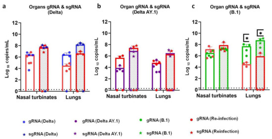 SARS-CoV-2 viral RNA load in organs after re-infection. Superimposed scatter plot depicting viral gRNA and sgRNA loads in the nasal turbinates and lungs of (a) Delta-, (b) Delta AY.1- and (c) B.1- (p = 0.0286, Mann–Whitney test, n = 4) infected hamsters during primary infection and re-infection on 7 DPI. The bars represent the means and the error bars the standard deviations. p value < 0.05 is represented as *.