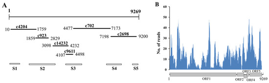 RNA-Seq derived contigs (A) and profile distribution of RNA reads (B) along genomic RNA of ASPV isolate DL. (A) Black bold lines represent contigs and their positions at the genome of ASPV-DL were indicated. Rectangles indicate the five segments (S) amplified by nRT-PCR. (B) A schematic diagram of the genome organization of ASPV isolate DL was used as reference.